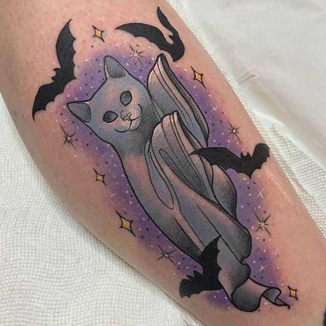 Єгипетська тату кішка з крилами символізує свободу, вихід за рамки буденного, боротьбу світлого і темного в людині, родючість і незалежність. Також це може бути образ провідника померлих у загробний світ.