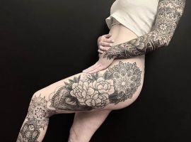 - Мереживо: Витончені плетива, ніби з тканини. Мереживо уособлює таємницю і жіночу чарівність, дозволяючи грати з прозорістю, і часто обирають для романтичного ефекту на стегні.