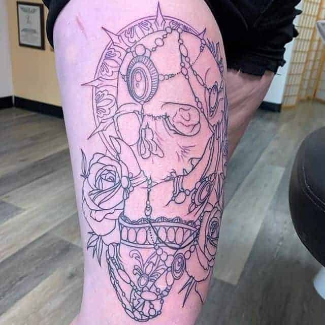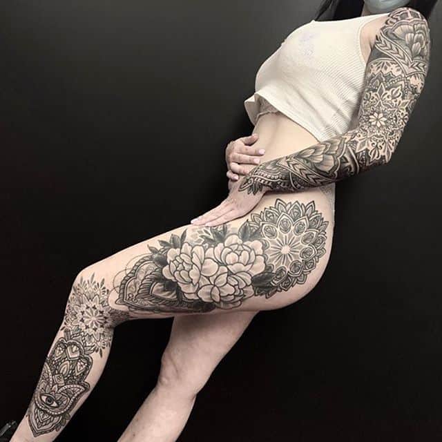 - Мереживо: Витончені плетива, ніби з тканини. Мереживо уособлює таємницю і жіночу чарівність, дозволяючи грати з прозорістю, і часто обирають для романтичного ефекту на стегні.