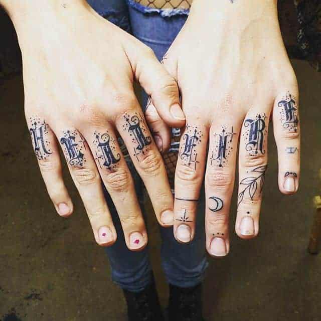 Тату на пальцях чоловічі кардинально відрізняються від жіночних. Найчастіше це-грубі написи, по одній букві на кожному пальці. Іноді роблять окремі тату на великому пальці, у вигляді якогось одного важливого символу.