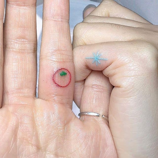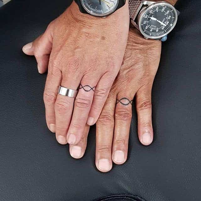 Ще одна популярна ідея саме на пальцях-обручки для пари. Закохані вірять в те, що їх почуття вічні і хочуть відобразити їх чимось таким же постійним. А що може бути більш постійним, ніж татуювання? Тому на безіменних пальцях, де ми носимо обручки, вони наносять зображення у вигляді кілець, як символ вірності і взаємної любові.