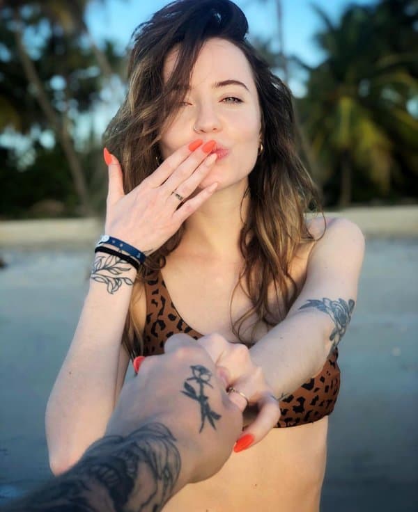 Також на лівій руці у Дорофєєвої є ще одне тату з романтичним підтекстом. Це досить лаконічне серце, виконане в контурному стилі, поєднане з написом.