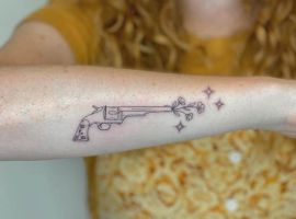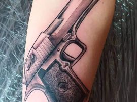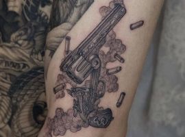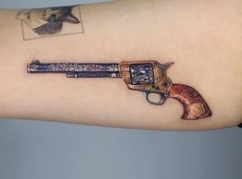 Але, звичайно, пістолет, револьвер тату може бути виконано і в багатьох інших стилях, починаючи від простої графіки і закінчуючи реалізмом з 3D ефектом. Орієнтуватися варто перш за все на те, який сенс б хотілося вкласти в тату. А майстри тату салону вже підберуть ідеальний ескіз.