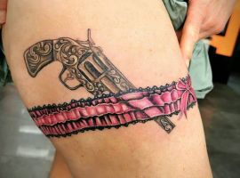 - Тату пістолета в підв’язці, панчосі або стегнах кобурі. Вибирають такі зображення дівчини небезпечні і красиві. Ескіз стає відображенням цієї хижої привабливості, безсумнівно впевненості, зухвалості. Якщо ця дівчина «цілиться», то від її чар ніхто не зможе врятуватися.
