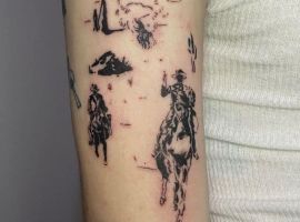 - Ковбойські. Символ авантюристів, шукачів правди – це ковбой з револьвером. Татуювання з ним говорять про всі ці риси сучасної людини. Але також тату ковбоя з двома револьверами може говорити і про люті, агресії. Таку людину краще не провокувати, адже можна отримати здачі.