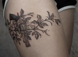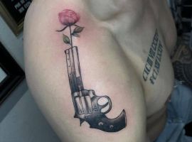 - Пістолет з квітами. Це популярний жіночий варіант. Але тату з трояндами може говорити про різні речі. Наприклад, це і символ помсти і того, що людина пережила зраду. Але також татуювання з трояндою може говорити про романтичность, пристрасность.