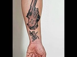 Наші майстри салона Альянс в Києві готові виконати будь-який варіант татуювання: пістолет на руці в стилі реалізм, ескіз з озброєним ковбоєм, татушка пістолета з квітами для дівчини і багато іншого. У «Портфоліо» можна подивитися фото тату від майстрів салону Альянс.