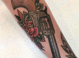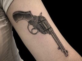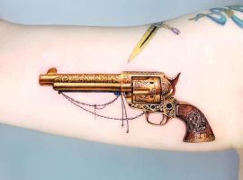 Татуювання з вогнепальною зброєю і татуювання ковбоїв стали неймовірно популярні в наш час. Пістолет татуювання можна побачити як у хлопців, так і у дівчат. При цьому мотиви тату з револьвером можуть бути самими різними. Багато що залежить від стилю зображення, присутності додаткових елементів. Але в будь-якому випадку майстри тату салону Альянс виконають для Вас ескіз з будь-якою зброєю.