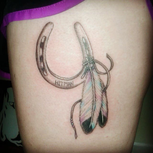 - Татуювання підкови з пір’ям – це успіх, радість, підйом по кар’єрних сходах, постійна удача.