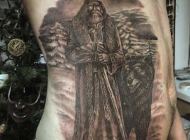 - Сивий старець у Ведмежій шкурі з посохом або палицею в руці на тлі природного пейзажу. Це зображення має таке ж значення, що і татуювання відбитка лапи, але через великий розмір виглядає більш виразно, підходить для чоловічого плеча, спини, грудей.