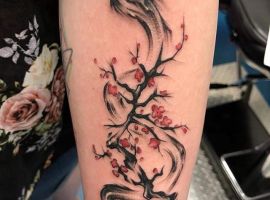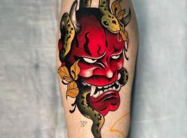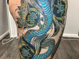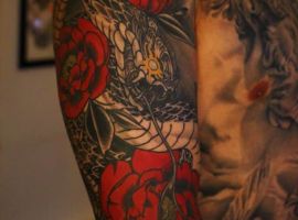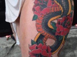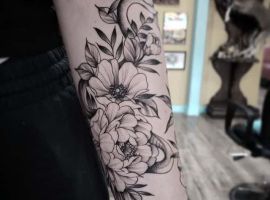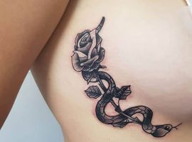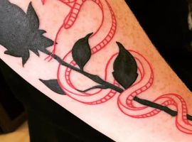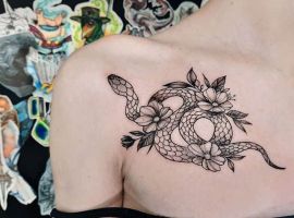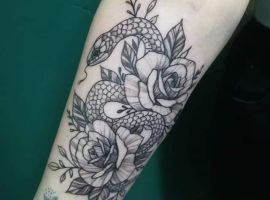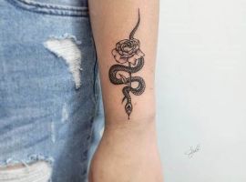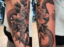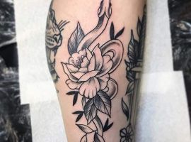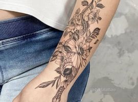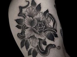 Змія і квіти. Така картинка виглядає дуже естетично на жіночому тілі. Тату буде символом спокуси, пристрасті, краси. Популярні зображення з півоніями, трояндою.