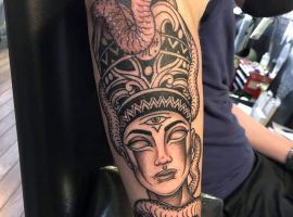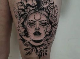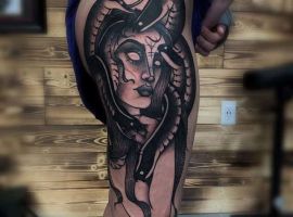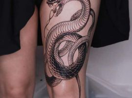- Реалізм: Детальне відтворення змії з м’якими переходами кольорів, що робить її граціозною та живою. Реалізм підсилює жіночу мудрість, як у богині, і чудово виглядає на стегні чи зап’ясті для акценту на чуттєвості.