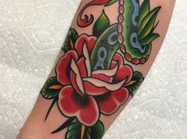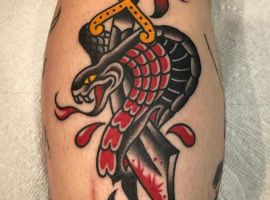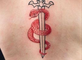 Кинджал зі змією. Тату кинджал окремо може мати позначення впертості, готовності битися, постояти за себе. У поєднанні з холоднокровним такий малюнок буде нести символ стійкості перед життєвими труднощами, завзятість, напористість, сміливість. Також зустрічаються ідеї тату з мечем. Сенс буде ідентичним.