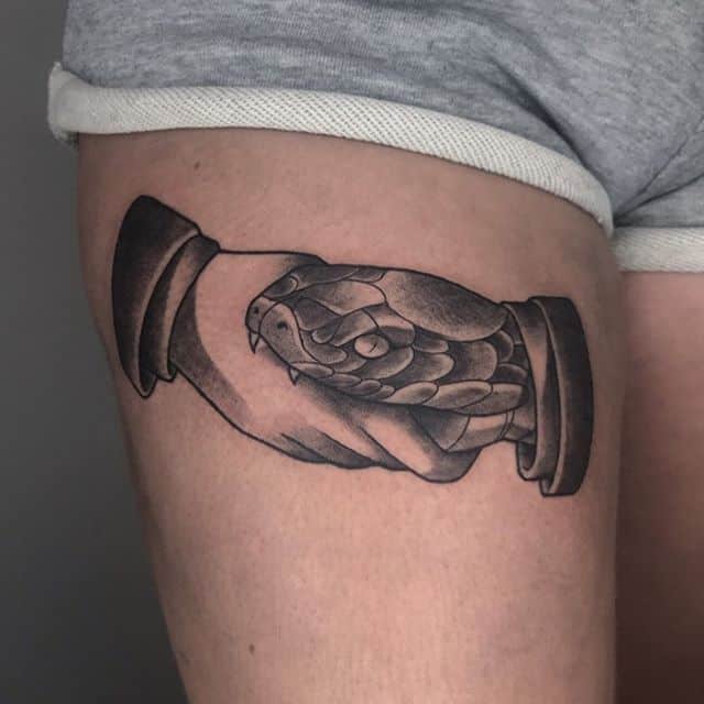 - Реалізм: Детальне відтворення змії з м’якими переходами кольорів, що робить її граціозною та живою. Реалізм підсилює жіночу мудрість, як у богині, і чудово виглядає на стегні чи зап’ясті для акценту на чуттєвості.