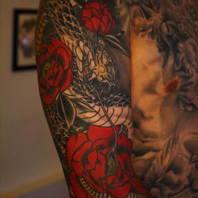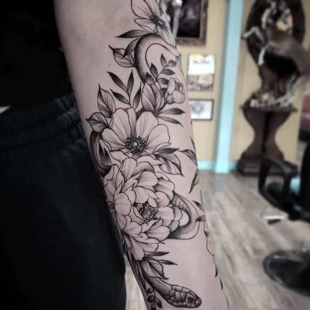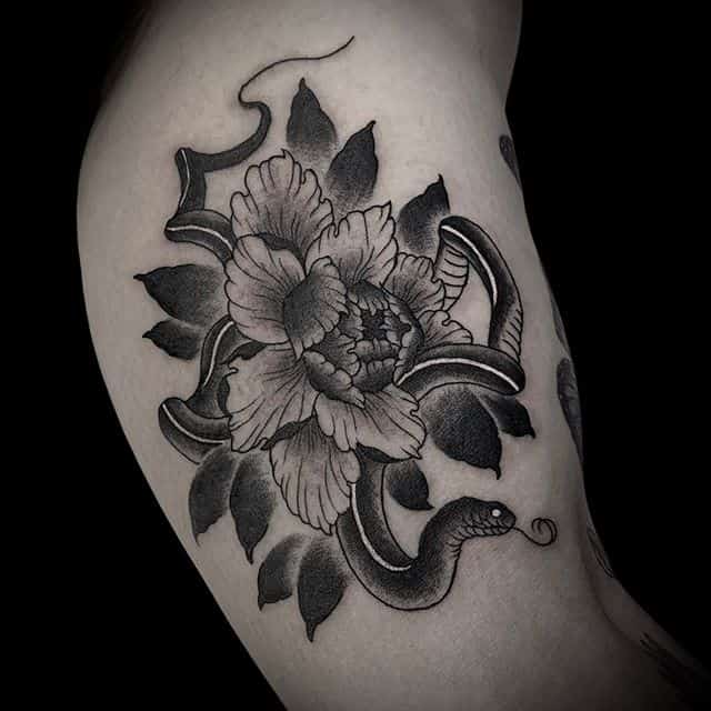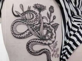 Змія і квіти. Така картинка виглядає дуже естетично на жіночому тілі. Тату буде символом спокуси, пристрасті, краси. Популярні зображення з півоніями, трояндою.
