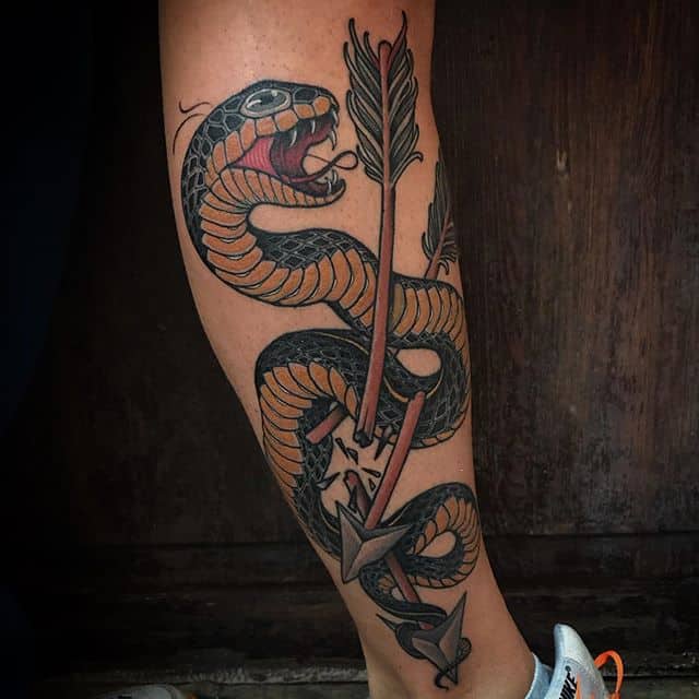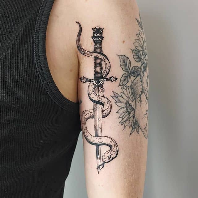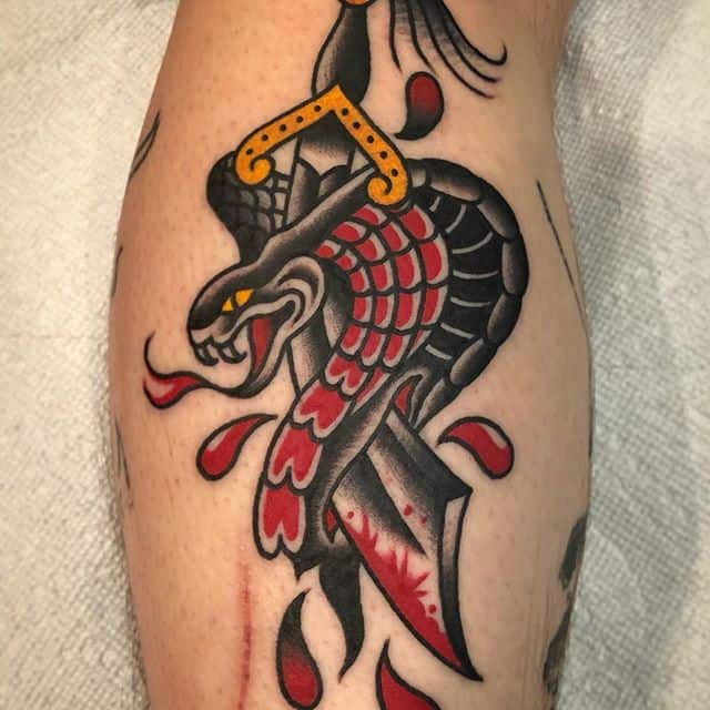 Кинджал зі змією. Тату кинджал окремо може мати позначення впертості, готовності битися, постояти за себе. У поєднанні з холоднокровним такий малюнок буде нести символ стійкості перед життєвими труднощами, завзятість, напористість, сміливість. Також зустрічаються ідеї тату з мечем. Сенс буде ідентичним.
