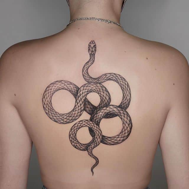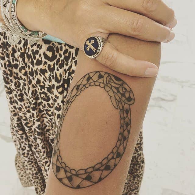 В історії Стародавньої Греції згадується міфічний змій Уроборос. Він відомий своєю здатністю жити вічно – з’їдаючи свій хвіст, його стара шкура відпадає і замість неї зароджується нова. У татуюваннях зазвичай має значення циклічності, відродження, вічної молодості, життя.