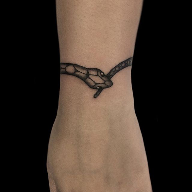 Змія ескіз у вигляді кільця. Зустрічаються зображення холоднокровної по колу на пальці або навколо зап’ястя. Такі кільця / браслети часто роблять як парні татуювання для двох закоханих. Вона може для них бути знаком їх вічної прихильності, пристрасті, любові один до одного.