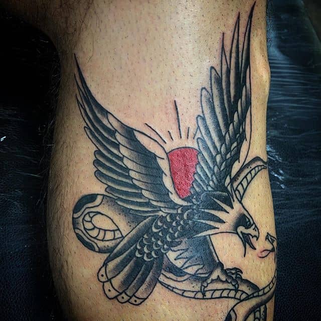 Орел разом зі змієм. Це поєднання уособлює боротьбу між стриманістю і спокусою, похоттю і мораллю, благородством і підлістю. У більшості випадків птах міцно тримає холоднокровну в дзьобі. Це говорить про владу позитивних якостей чоловіка над негативними, як мінімум його прагнення до цього.
