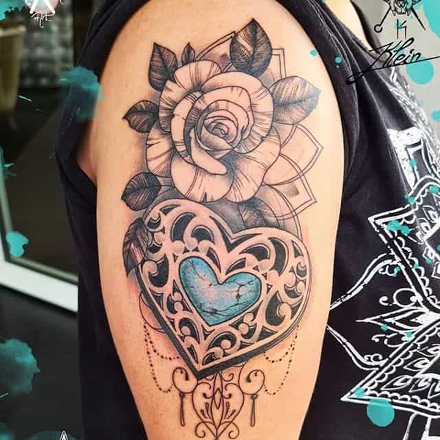 - Роза – це прообраз гармонії, вдалих відносин, радості і краси. Таке тату привертає гармонію у відносинах. Найчастіше квітка зображується в червоному або рожевому кольорі. Серце з червоною трояндою – символ пристрасті.