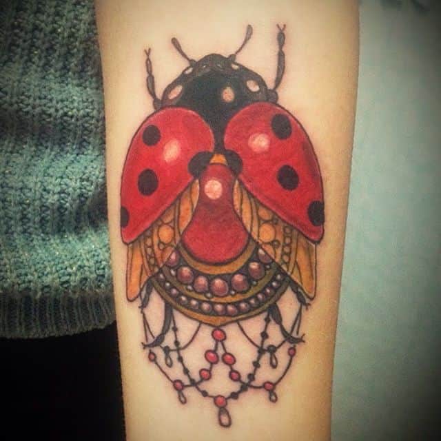 - Сонечко привертає удачу, матеріальне благополуччя. Це сильний талісман, що допомагає залучити щастя, а також оберіг, що захищає від зла і проблем. Часто малюнок сонечка вибирають ті, хто сподівається на виконання бажань. Цей малюнок вважається жіночим, він допомагає в дітонародженні.