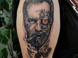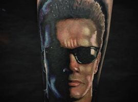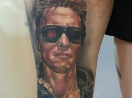 Також дуже часто Термінатора зображують в реалістичній манері. Звичайно це буде портрет актора Шварцнегера в даному образі, часто зображують кадри з фільмів. Термінатор часто носив чорну шкіряну куртку і чорні окуляри. Іноді наносять на шкіру відомий кадр з кіно, в якому герой їде на мотоциклі. Також круто виглядає обличчя персонажа, після того, як його штучна шкіра була частково пошкоджена, і з-під неї видніються механічні деталі і відоме лазерне око. Звичайно подібні малюнки на шкірі вимагають обсягу і високого професіоналізму майстра, як у салоні Альянс у Києві. Так що дуже важливо не тільки вдало підібрати ескіз, але і художника, який буде втілювати ідею на шкірі.