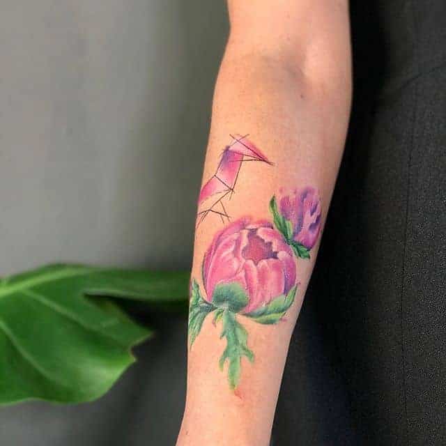 Другі за популярністю-тату півонії. Ці квіти красиві, символічні, і універсальні. Значення півонії: удача, багатство, процвітання. Татушки з ними допоможуть залучити успіх у всіх сферах.