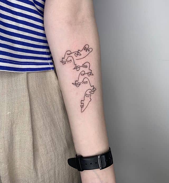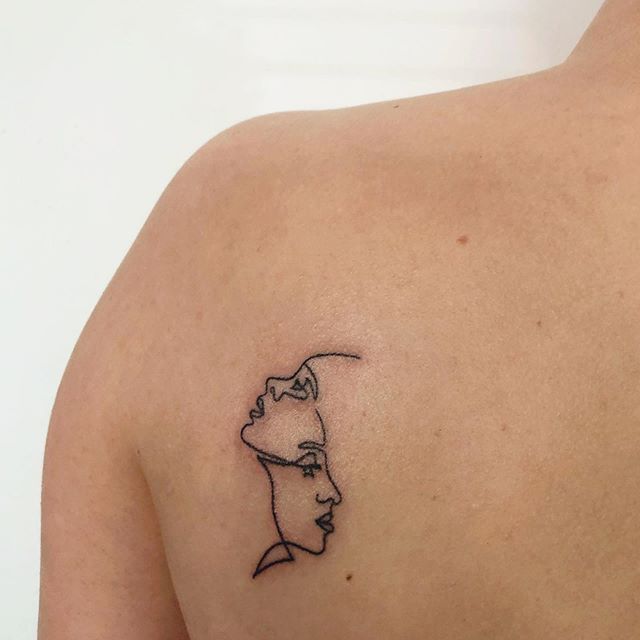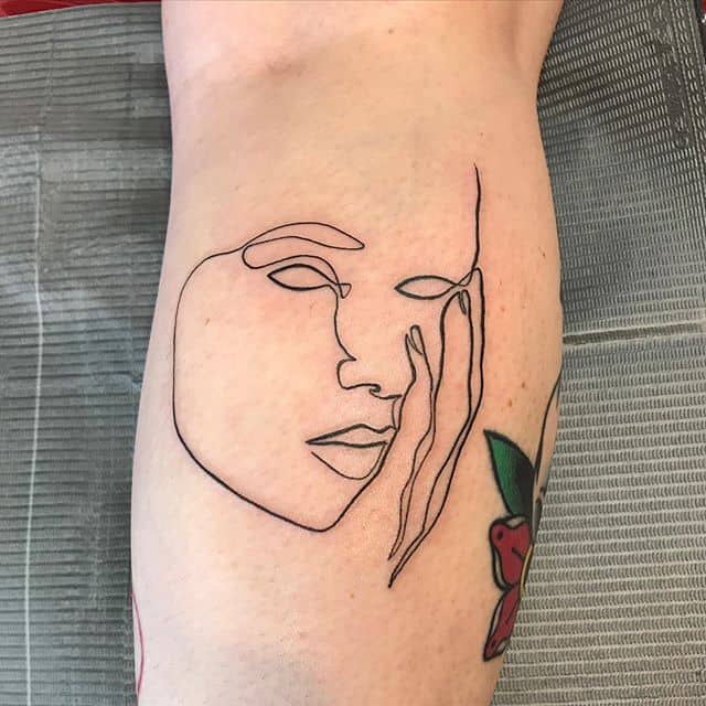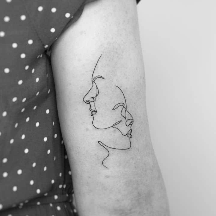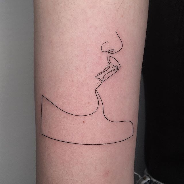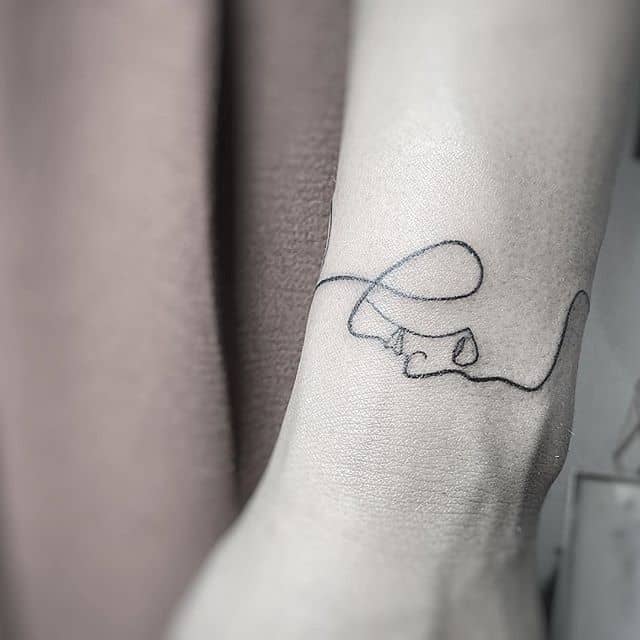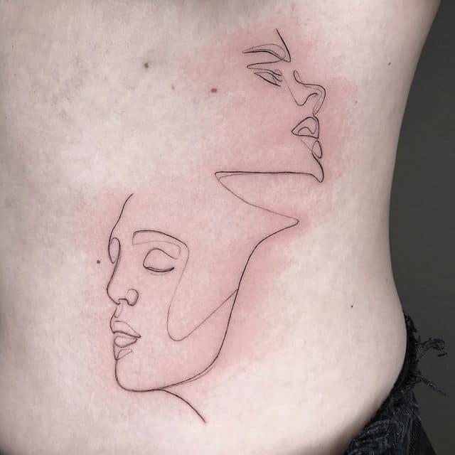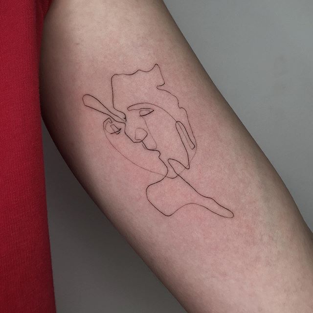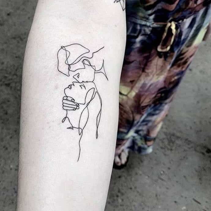 Поцілунок тату однією лінією просто заворожує! Така тату однією лінією підкреслить загадковість і швидкоплинність моменту і, звичайно, романтичність. Тату однією лінією поцілунок у вигляді губ або сблизившихся осіб – зараз найпопулярніша ідея в даному стилі!