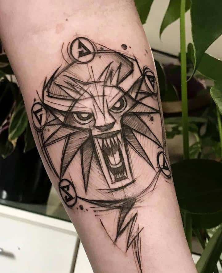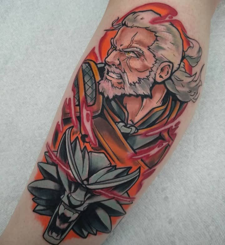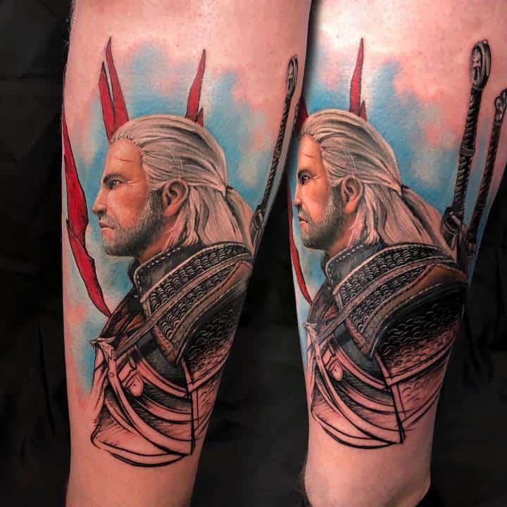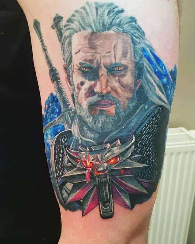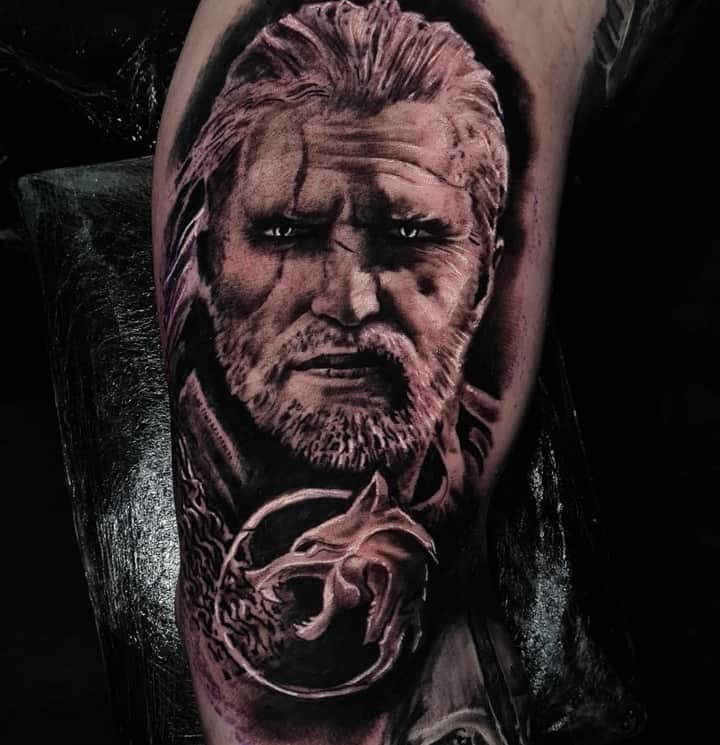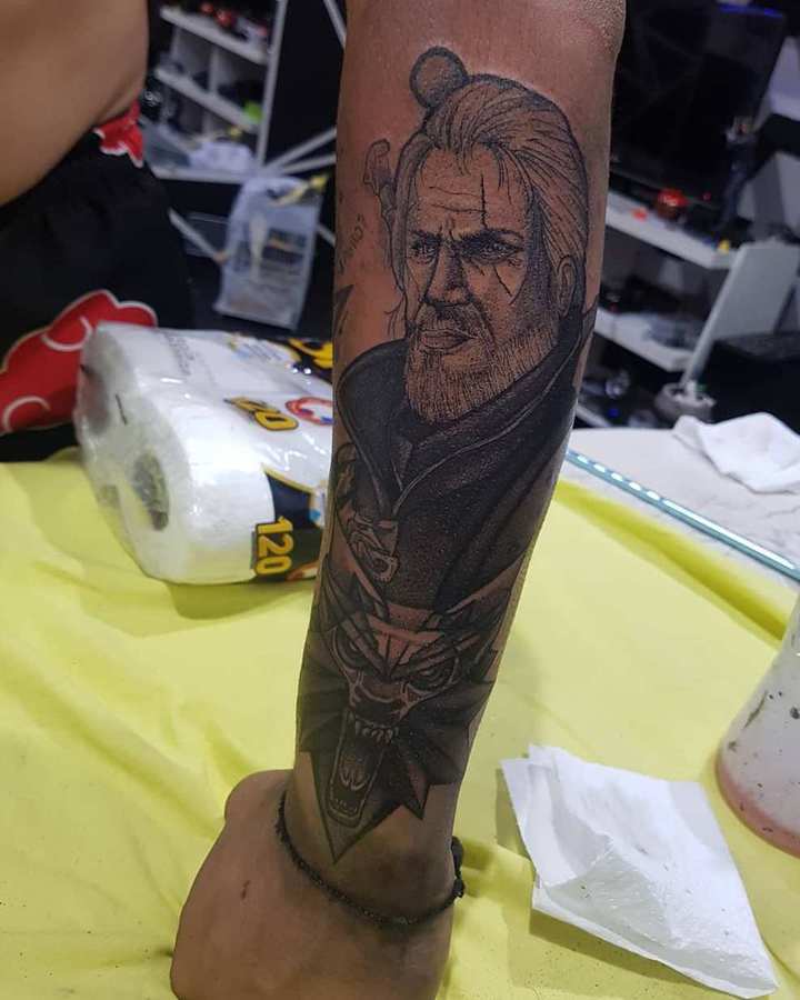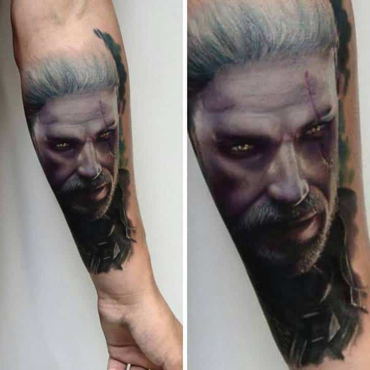 Геральт часто зображується в профіль. В якості фону може використовуватися малюнок чудовиська. Деякі замовляють набивання монстрів. Зазвичай подібні ідеї виконують одним кольором. Найчастіше чорним. Монохромність створює атмосферу страху і містики.