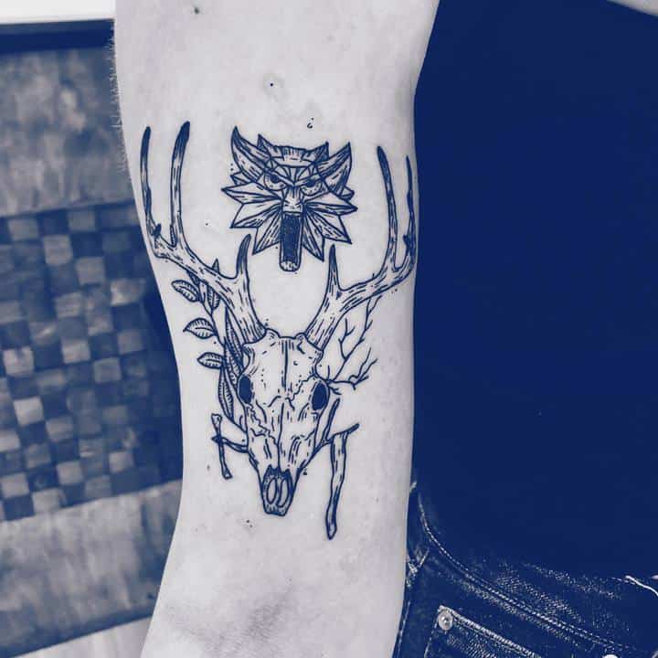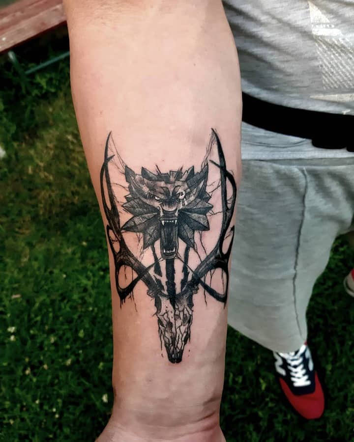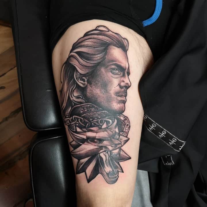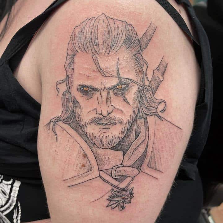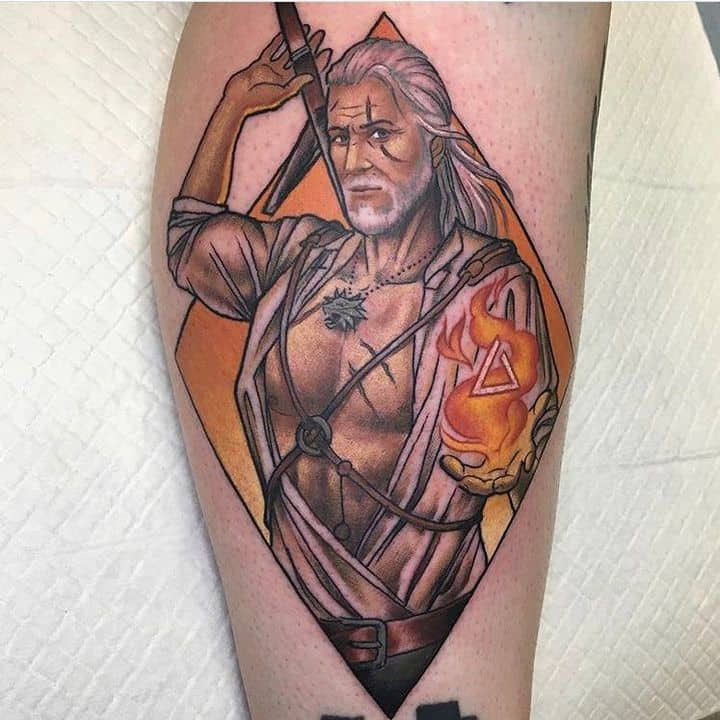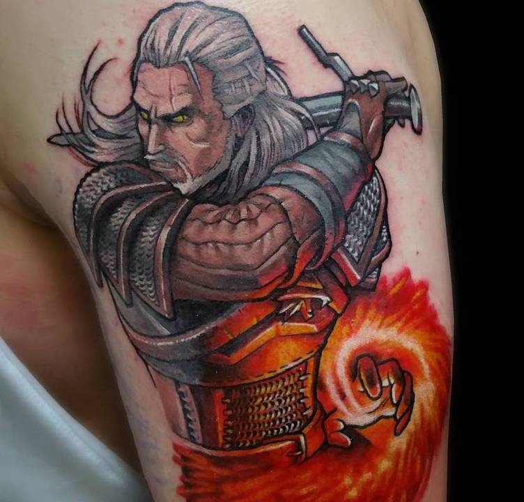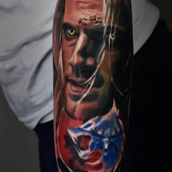 Геральт часто зображується в профіль. В якості фону може використовуватися малюнок чудовиська. Деякі замовляють набивання монстрів. Зазвичай подібні ідеї виконують одним кольором. Найчастіше чорним. Монохромність створює атмосферу страху і містики.