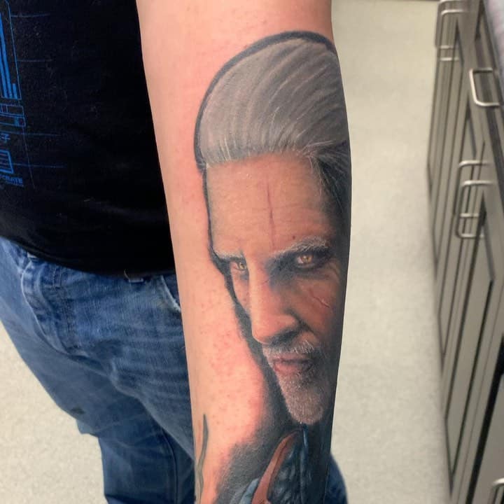 Татуювання Відьмак може бути виконане кількома способами. У вигляді портрета самого відьмака. Геральт зображується один або зі своєю прийомною дочкою Цирі. Принцеса Циріл була обіцяна Відьмаку в якості виплати за те, що він врятував її батька від смерті. В якості подяки той обіцяв Геральту те, чого він не знає в своєму будинку. Це і була дівчинка.