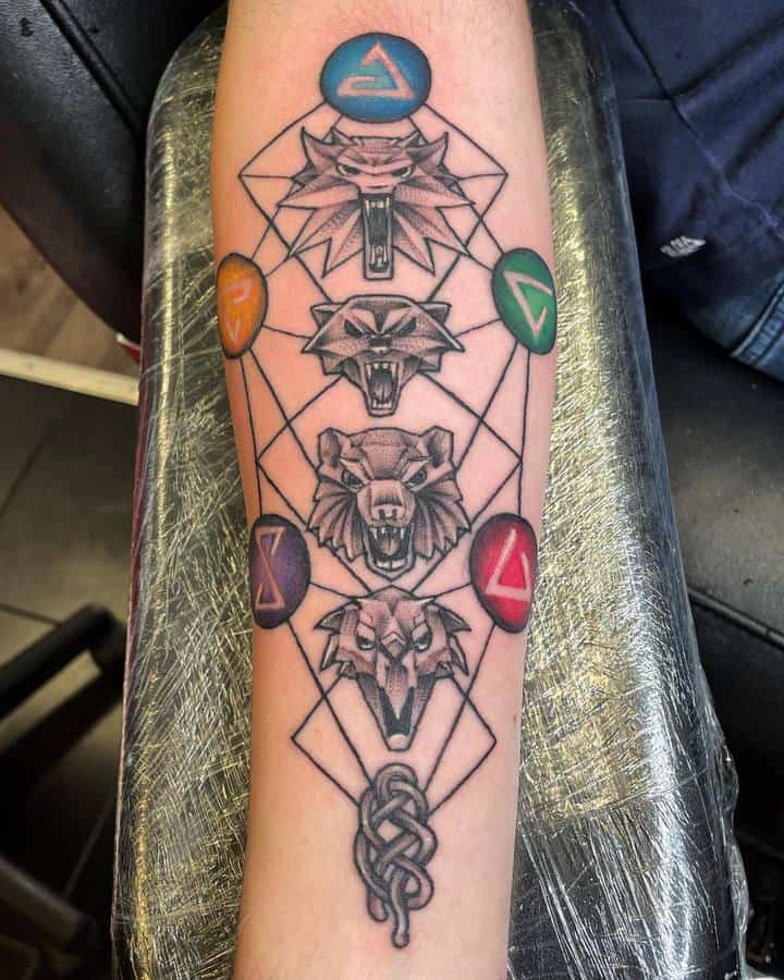 Тату у вигляді медальйона Геральта являє собою зображення образу вовка або перевертня. Малюнок означає здатність протистояти нападкам ворогів, агресію, силу. Наносити його зазвичай вважають за краще чоловіки. Хоча зрідка можна зустріти Його і у жінок.