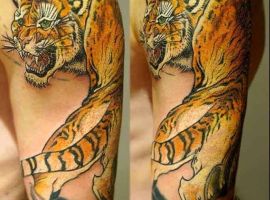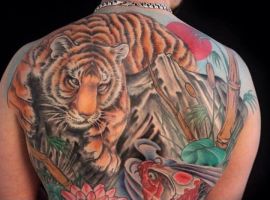 3. Тигр. Вважається, що традиційне зображення тигра захищає володаря від невдач і хвороб. Тигр в стилі тату Орієнтал виражається як символ сили, хоробрості і стійкості.