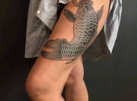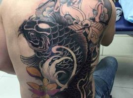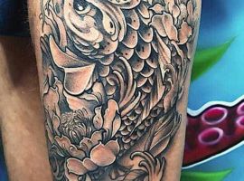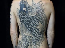 2. Коропи Коі. Зображення священних риб характерно для традиційного Хорікацу. Родом риби з Китаю, вважалося, що лише вони здатні плисти проти течії річки Хуанхе і перетворюватися в драконів. Тому в якості Орієнтал ці тату символізують силу, хоробрість, прагнення до успіху і вміння долати труднощі.