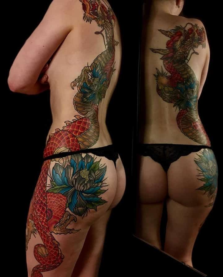 1. Дракон. В японській культурі, на відміну від західної традиції, тату дракона несе виключно позитивне значення. Вважається, що міфічна істота тісно пов’язана з водною і повітряною стихіями – головними благодійниками острівної держави. Малюнок з драконом здатний служити оберегом і надавати його носію сил.