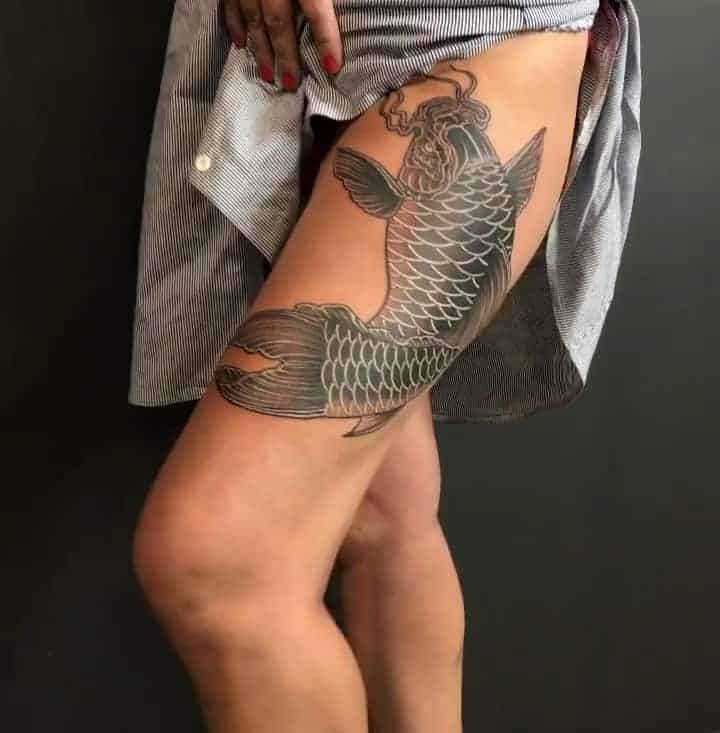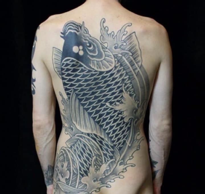 2. Коропи Коі. Зображення священних риб характерно для традиційного Хорікацу. Родом риби з Китаю, вважалося, що лише вони здатні плисти проти течії річки Хуанхе і перетворюватися в драконів. Тому в якості Орієнтал ці тату символізують силу, хоробрість, прагнення до успіху і вміння долати труднощі.