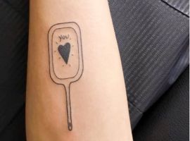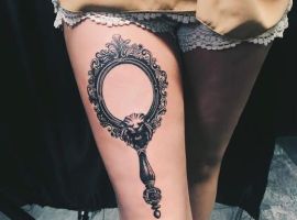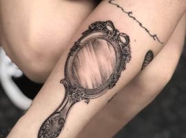 Значення татуювання дзеркало також полягає в жіночому початку. Це атрибут щоденного використання дівчат, а тому він уособлює жіночність, красу, грацію, увагу і любов до себе.