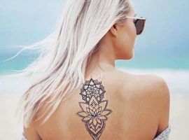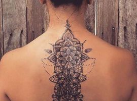 Татуювання на спині також досить рідко помітні оточуючим. Але малюнки на цій області неодмінно викличуть фурор на пляжі або на званому балу, куди дама з’явиться у відкритому ззаду платті. Стильно виглядають татушки, що йдуть від шиї вниз по хребту.