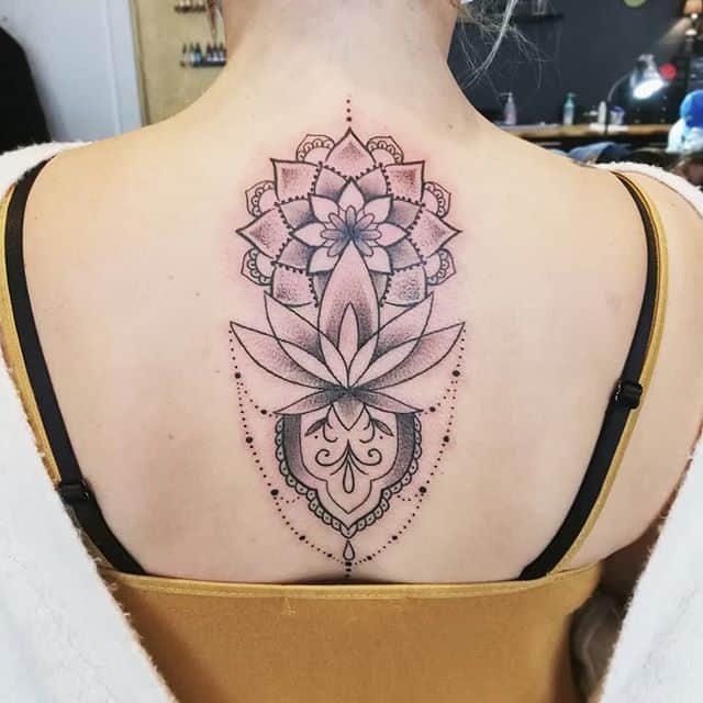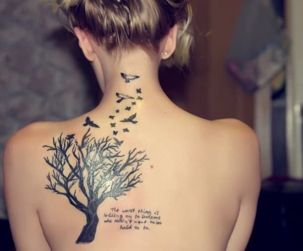 Татуювання на спині також досить рідко помітні оточуючим. Але малюнки на цій області неодмінно викличуть фурор на пляжі або на званому балу, куди дама з’явиться у відкритому ззаду платті. Стильно виглядають татушки, що йдуть від шиї вниз по хребту.