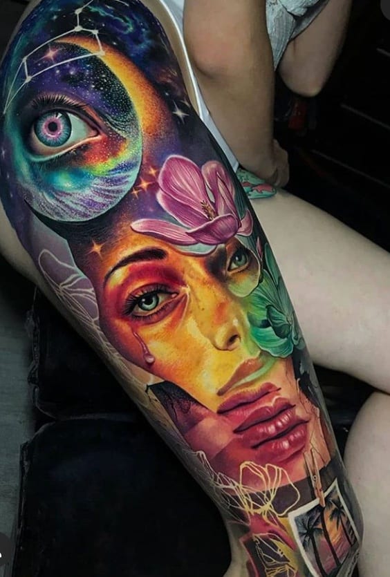 Татуювання на стегнах зазвичай демонструють сексуальність, плавні вигини жіночого тіла. Зазвичай роблять ажурні візерунки, квіти, тварин.