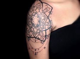 Тату на плечі для дівчат з геометричними фігурами виглядають по-справжньому зухвало. Їх витоки лежать в племінних татуюваннях полінезійських народів. Сполучення різних фігур мають різні значення, але зазвичай позначають свободу характеру, силу волі і здатність уникнути залізного гніту зовнішніх обставин.