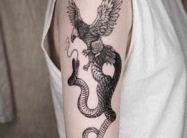 Жіночі тату на плечі з цією рептилією міцно асоціюються у нас з персонажами фільмів і аніме, передають нам їх хоробрість і силу. Відбитки образу східного і західного драконів знаходяться в міфології багатьох європейських і азіатських народностей.
