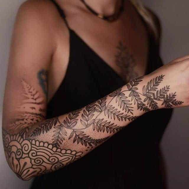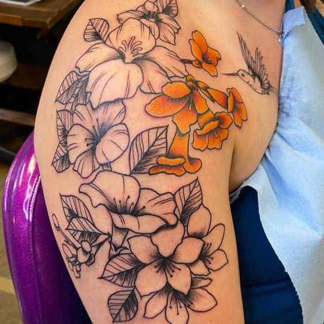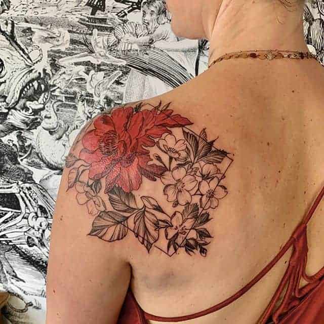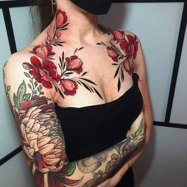 Іноді дівчині підходять ескізи фантастичних кольорів, яких не існує в реальному житті. Клієнтка салону може вибрати екзотичні рослини, що відображають риси характеру або скласти елементи квітки на свій смак. Квіти і квіткові візерунки чудово виглядають на плечах.