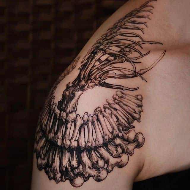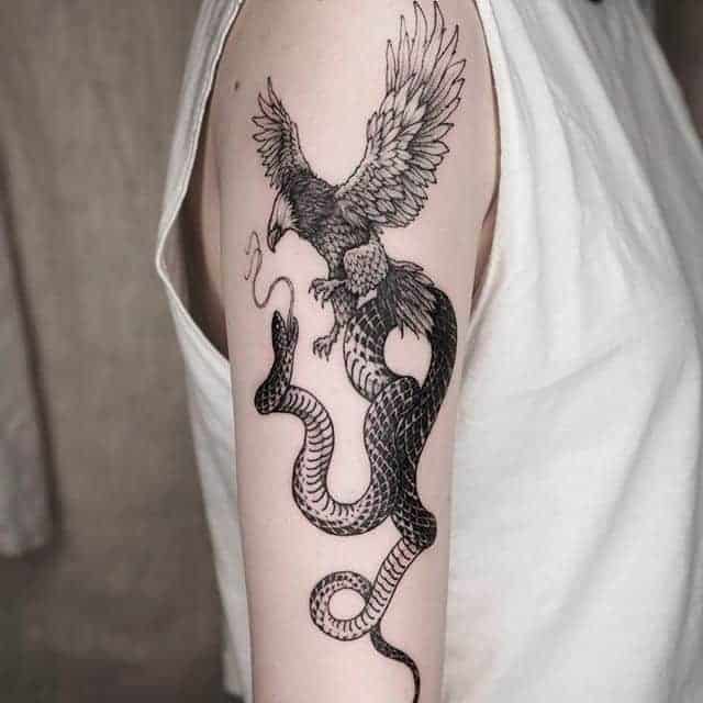 Жіночі тату на плечі з цією рептилією міцно асоціюються у нас з персонажами фільмів і аніме, передають нам їх хоробрість і силу. Відбитки образу східного і західного драконів знаходяться в міфології багатьох європейських і азіатських народностей.