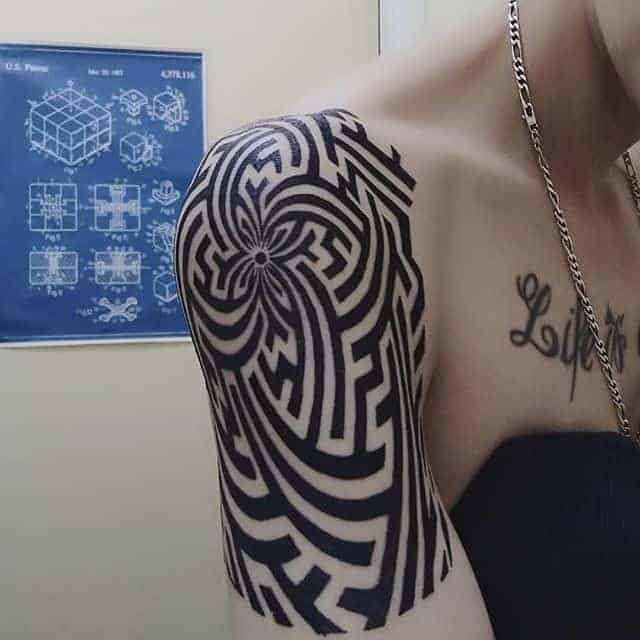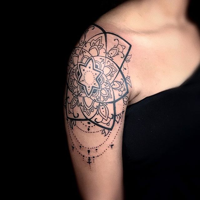 Тату на плечі для дівчат з геометричними фігурами виглядають по-справжньому зухвало. Їх витоки лежать в племінних татуюваннях полінезійських народів. Сполучення різних фігур мають різні значення, але зазвичай позначають свободу характеру, силу волі і здатність уникнути залізного гніту зовнішніх обставин.