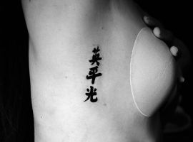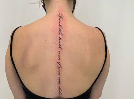 - На спині дівчата зазвичай роблять довгу фразу, написану каліграфічним шрифтом, спрямовану вертикально вздовж хребта.