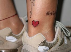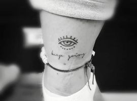 - Дуже красиво і витончено виглядає жіноче тату на щиколотці, а також збоку уздовж стопи. Тут зазвичай роблять невеликі, але ємні фрази, доповнені мініатюрними символами. Але набивання тату на нозі – процедура не найприємніша, оскільки на цих ділянках шкіра тонка, між нею і кістками мало м’яких тканин.