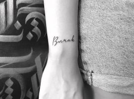 - Другі за популярністю – написи на зап’ясті. Зазвичай набивають короткі фрази тонким шрифтом. Незважаючи на затребуваність, тату написи на руці для дівчат вдалі не на всіх ділянках. Наприклад на пальцях і на долоні вони небажані, так як швидко стираються, піддаються впливу ультрафіолету. Доводиться їх коригувати.