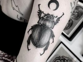 Неординарна прикраса тіла, яке стає амулетом людини – тату жук скарабей! У давнину люди вірили, що цей священний жук здатний притягувати удачу і багатство, а також і захищати від впливу темних сил. Зараз жук скарабей татуювання набивають однаково часто як чоловіки, так і жінки. При цьому малюнки скарабея можуть виконуватися в самих різних стилях: починаючи від графіки і закінчуючи треш-полькою і олд-скулом.