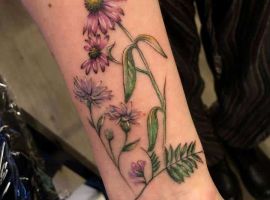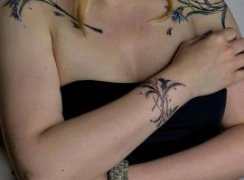 - Руках и ногах. Венки из цветов набивают вокруг запястья или щиколоток. Изображение целого букета наносят на предплечья. На плечо наносят небольшие цветные и черно-белые тату. Бедро и икры часто украшают одним цветком, на длинном стебле.